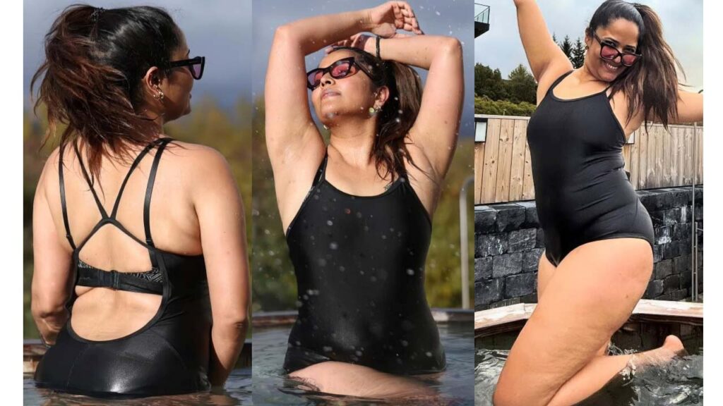 Anasuya bharadwaj spicy black swimsuit bath tub photos..